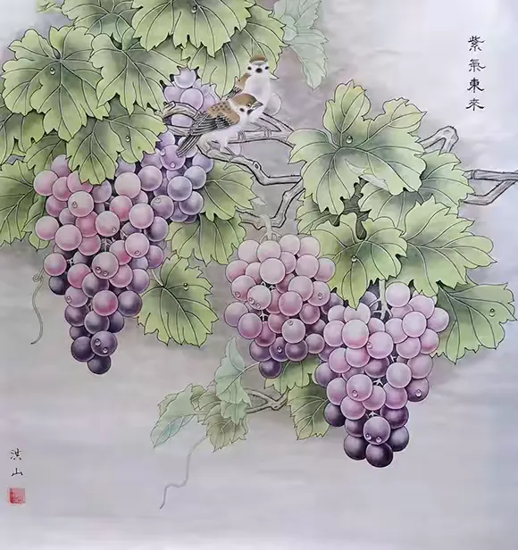 杜洪山的花鸟画题材始终围绕 “自然之真” 与 “生活之善” 展开,既师法古人对花鸟神韵的捕捉,更师法造化对生活细节的洞察。他笔下的题材包罗万象,既有葡萄、谷子、菊花等承载丰收祥瑞寓意的田园作物,也有雄鸡、翠鸟、松鼠等灵动鲜活的禽鸟生灵,每一种题材都饱含着对生活的热爱与对美好的祈愿。