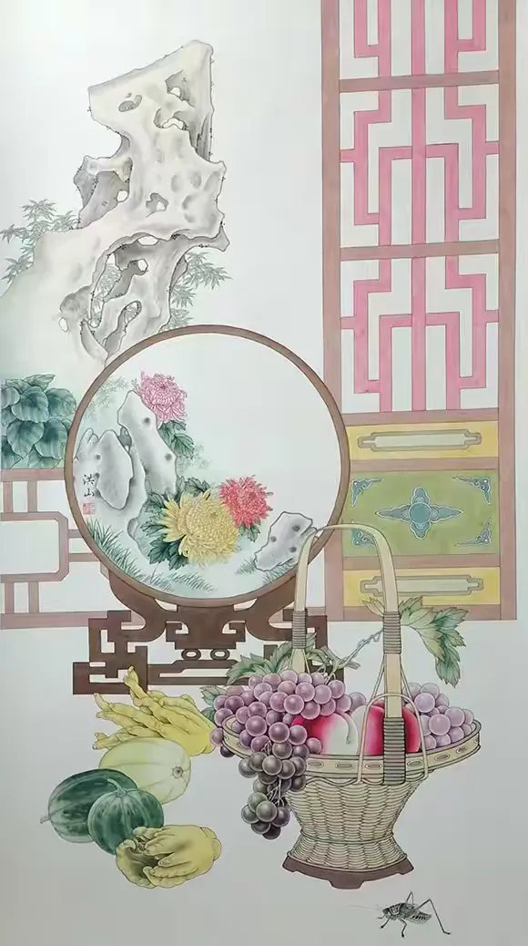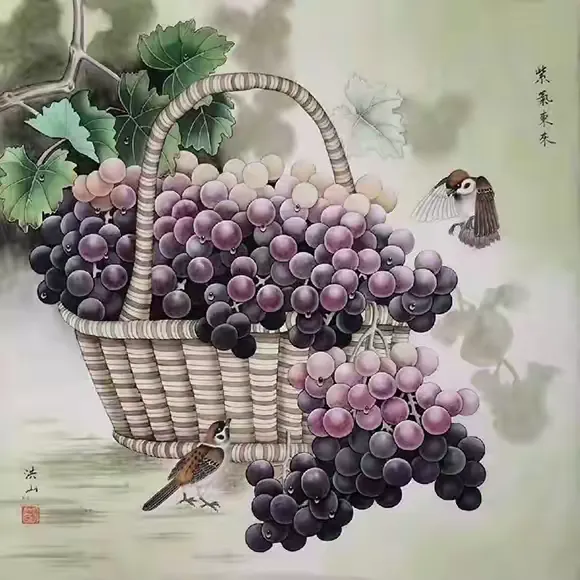 绘葡萄时,藤蔓交错缠绕、果粒饱满密集,却在枝蔓间隙留白,让叶片的舒展与果实的堆叠形成疏密对比,既凸显了葡萄的丰盈质感,又给观者留下想象空间;