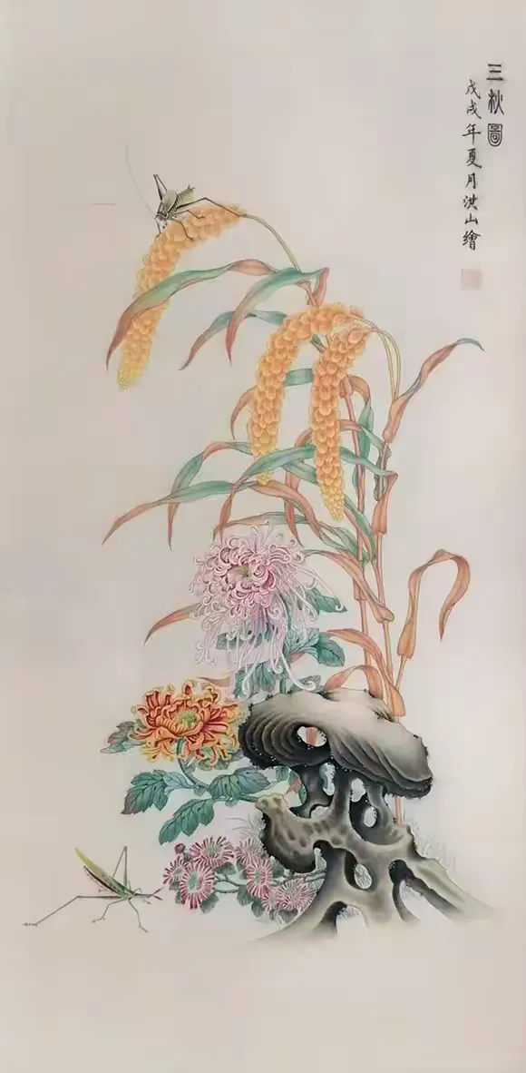 他善于从日常场景中提炼艺术灵感,不追求奇花异草的猎奇,而是在寻常花鸟中挖掘诗意 —— 葡萄的饱满对应 “多子多福” 的民俗期盼,柿子的红润暗含 “事事如意” 的吉祥祝愿,雄鸡的昂扬彰显 “进取向上” 的生命气象,就连草丛间的蝈蝈、枝头上的麻雀,都带着扑面而来的生活气息。这种 “以俗为雅” 的题材选择,让他的作品既符合大众的审美期待,又通过艺术提炼赋予其文人雅趣,实现了 “雅俗共赏” 的审美平衡。