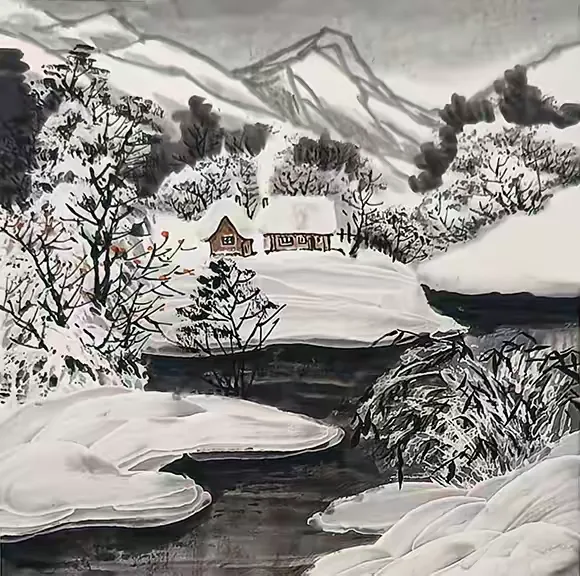 吴鸿鹏的艺术底色,是对传统技法的敬畏与深耕。他早年师从山水画名家王中年,后入于志学工作室深造,得李宝林、苗重安等诸家点拨,兼容并蓄中打下坚实根基。在冰雪画核心技法上,他娴熟运用滴白、泼白、雪皴法等经典技艺,将冰雪的晶莹质感与空间层次表现得淋漓尽致;更难能可贵的是,他不困于传统,开创散锋画树、点子笔技法、矾墨留白等独特表现方式,让笔下的林木更显苍劲灵动,水中顽石更具肌理质感,为冰雪画的技法体系增添了鲜活元素。这种 "承古而不泥古" 的创作态度,让他的作品既保有冰雪画派的基因,又彰显出鲜明的个人印记。