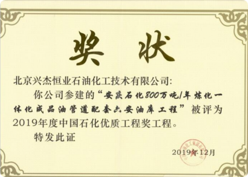 (安徽六安油库“2019年度中国石化优质工程奖”奖状)
